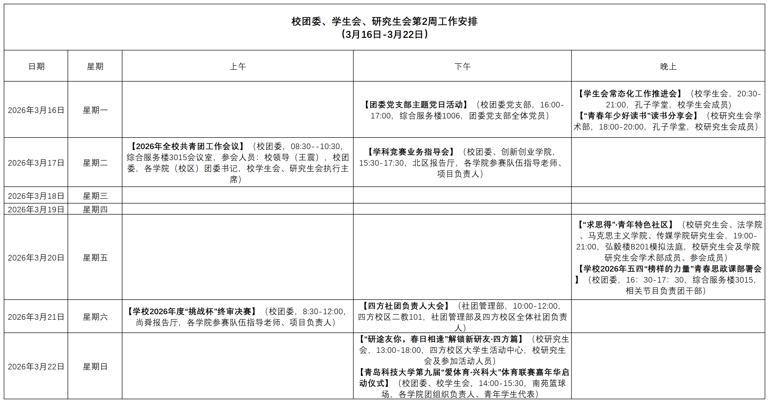 校团委、学生会、研究生会第2周工作安排